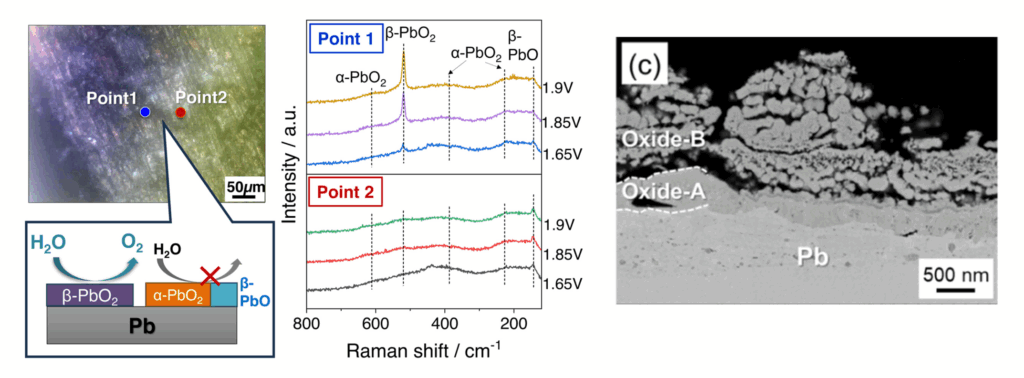 亜鉛(Zn)は鋼材のめっきや合金材料(真鍮)などに使用される重要な金属元素の一つです。亜鉛の製造方法の一つである電解精錬法の陽極では酸素の発生反応が進行しますが、陰極で進行する亜鉛の還元反応に対し過電圧(反応進行に必要な電圧)が大きく、エネルギー効率向上の妨げとなっています。本研究では、亜鉛電解精錬における酸素発生反応をより効率的に進行するための安価かつ高性能な触媒を開発することを目的としています。これまでに、従来陽極材料として用いられてきた鉛電極上での鉛酸化物触媒の生成挙動について初めてその場ラマン分光法により分析し、電極表面上の局所環境に応じて生成する酸化物の結晶相が変化し、結晶相に応じて触媒活性が異なることを明らかにしました。