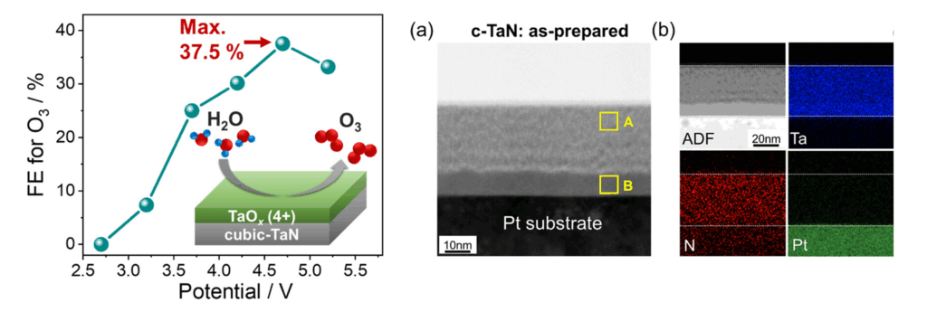 オゾンは大気中で無害な酸素に自然分解することから、半導体や食品などの洗浄剤として注目されています。私たちは電解オゾン生成用の新たな電極触媒としてタンタル窒化物(TaN)に着目し、オゾン生成効率がTaNの結晶構造に著しく依存し、NaCl構造のTaNが高いオゾン生成選択性を有することを初めて見出しました[1]。